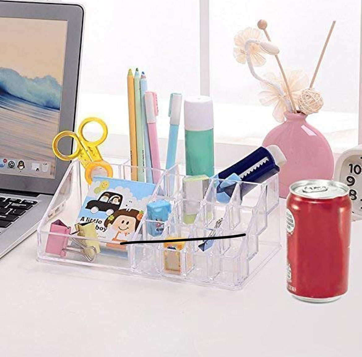 - Keeps lipsticks, brushes, and compacts in one neat space.